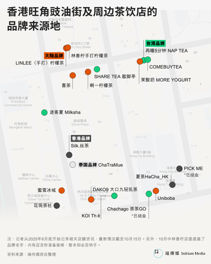 在香港旺角豉油街的三间手打柠檬茶,都是在大陆具规模的品牌,同样在2023年进驻香港。当中的 LINLEE 手打柠檬茶在2012年于广州湛江创立,2024年的总分店数目逾1600间,至今在香港已连开9间分店。旁边的林香柠同样来自湛江,由3位80后香港人引进,一度有13间分店。至于2015年在广州增城区冒起的啊一柠檬茶全港累计至少10间分店。
