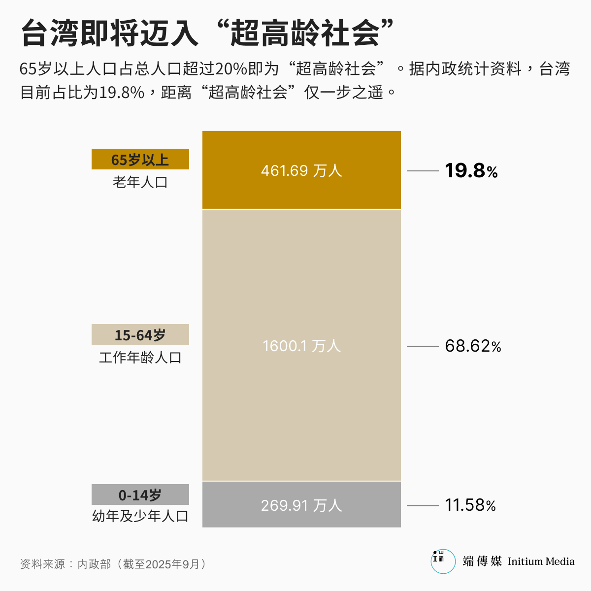 台湾社会的老化,几乎是在人们还来不及反应时,便迎面撞上。1993年,依据世界卫生组织(WHO)的定义,台湾步入“高龄化社会”(老年人口占总人口比例高于7%);2018年,跨入“高龄社会”(高于 14%)。在今年9月底,据台湾内政统计资料显示,65岁以上人口占比已是19.80%,距离正式迈入“超高龄社会”——亦即65岁以上人口占总人口超过20%——仅差一步之遥。这意味著,街上每五个人,就会有一位长者。