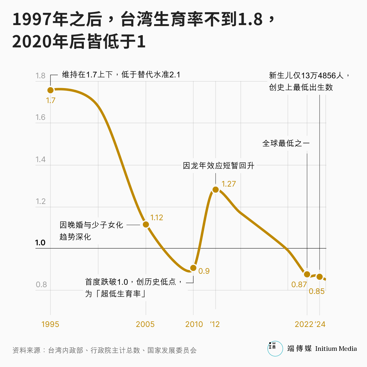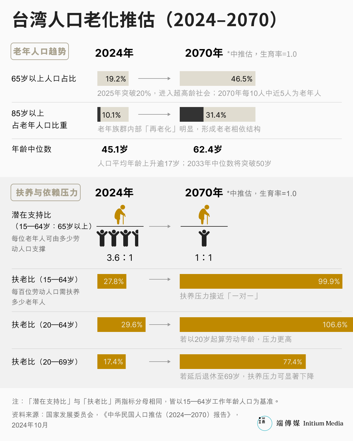 此外,台湾的生育率长期低迷,近年来稳坐国际排名最末段,2024年的生育率仅0.87。国家发展委员会推估,用来表现社会扶养负担的“扶老比”(每100个工作年龄人口所需扶养的老年人口数),将从2020年约5.4名青壮年扶养一名老人,恶化至2040年的2.7:1,到了2070年,更将趋近1:1的极限景况。此意味著,一个工作人口必须独自负担一名老人的生计。这是台湾社会不到50年后的将来。