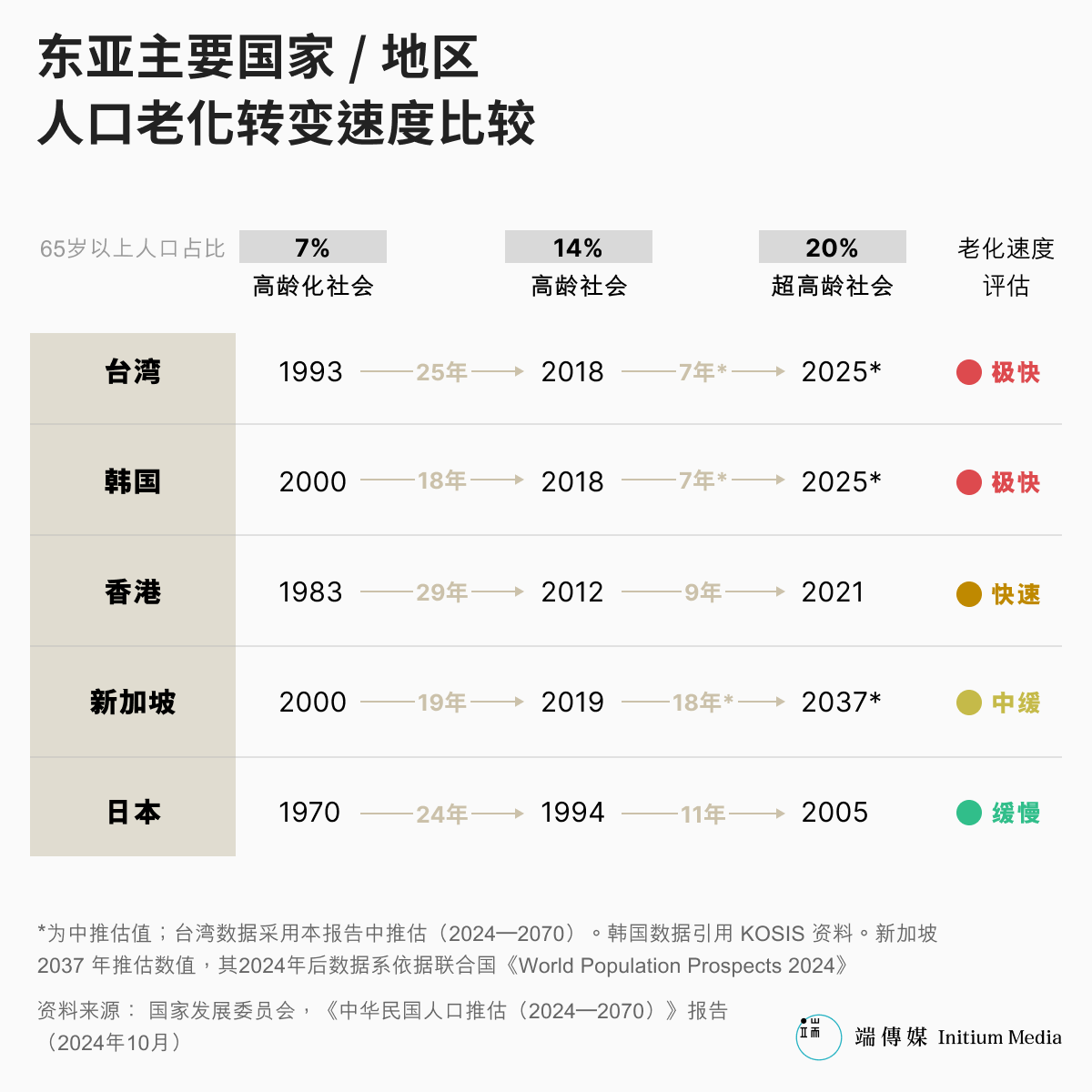 从“高龄社会”奔向“超高龄社会”,据国家发展委员会2024年发布的报告指出,德国花了36年,邻近的日本也花了11年;台湾,只用了短短七年。在少子女化趋势的加乘下,人口变迁就像是一班失速列车,社会的应对机制、公共建设乃至人们的心理准备,都远远赶不上人口结构的剧变,缺工潮、长照问题等一一浮现。