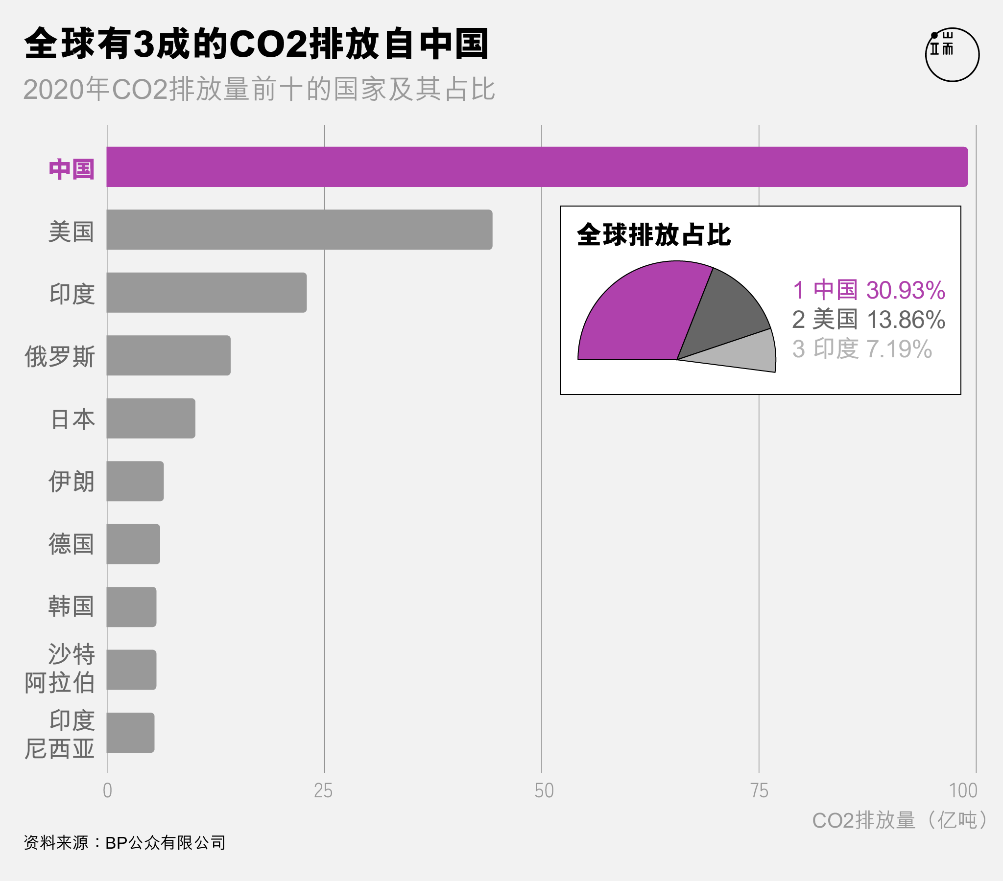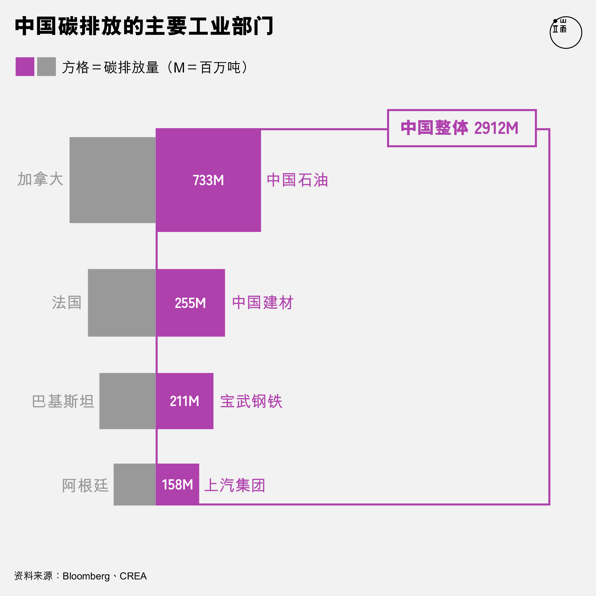Bloomberg根据芬兰的环境研究项目组CRE在2021年发布的一项研究,制作了一个互动页面,其中提到,数十家大型中国国有企业,主要集中在电力、钢铁、水泥、炼油等高耗能产业,占据了中国乃至世界主要的碳排放份额。例如,国企中国石油的碳排放量甚至超过加拿大,而中国建材的碳排放则相当于法国。2019年,中国产生的超过130亿吨二氧化碳,其中就有40亿吨来自建筑材料钢铁、水泥等的生产。