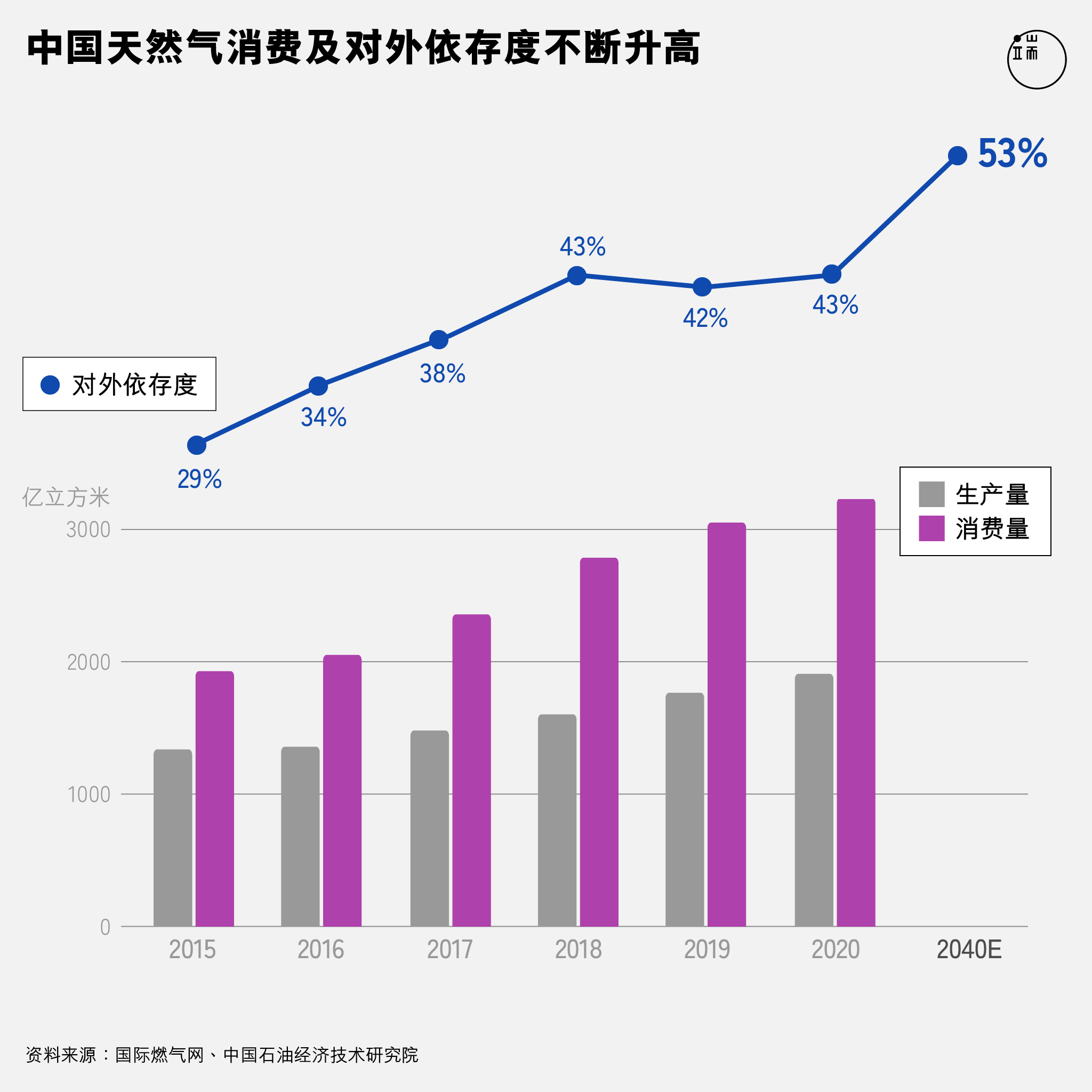 由于中国已探明的化石能源中,天然气仅占6%,因而自2016年起,天然气就成为中国净进口的主要物品之一,2018年,中国更成为世界最大的天然气进口国。据中国石油经济技术研究院测算评估,2020年中国天然气的对外依存度高达43%,而随著民用“煤改气”的进一步推进,预计2040年,天然气依存度将达53%。