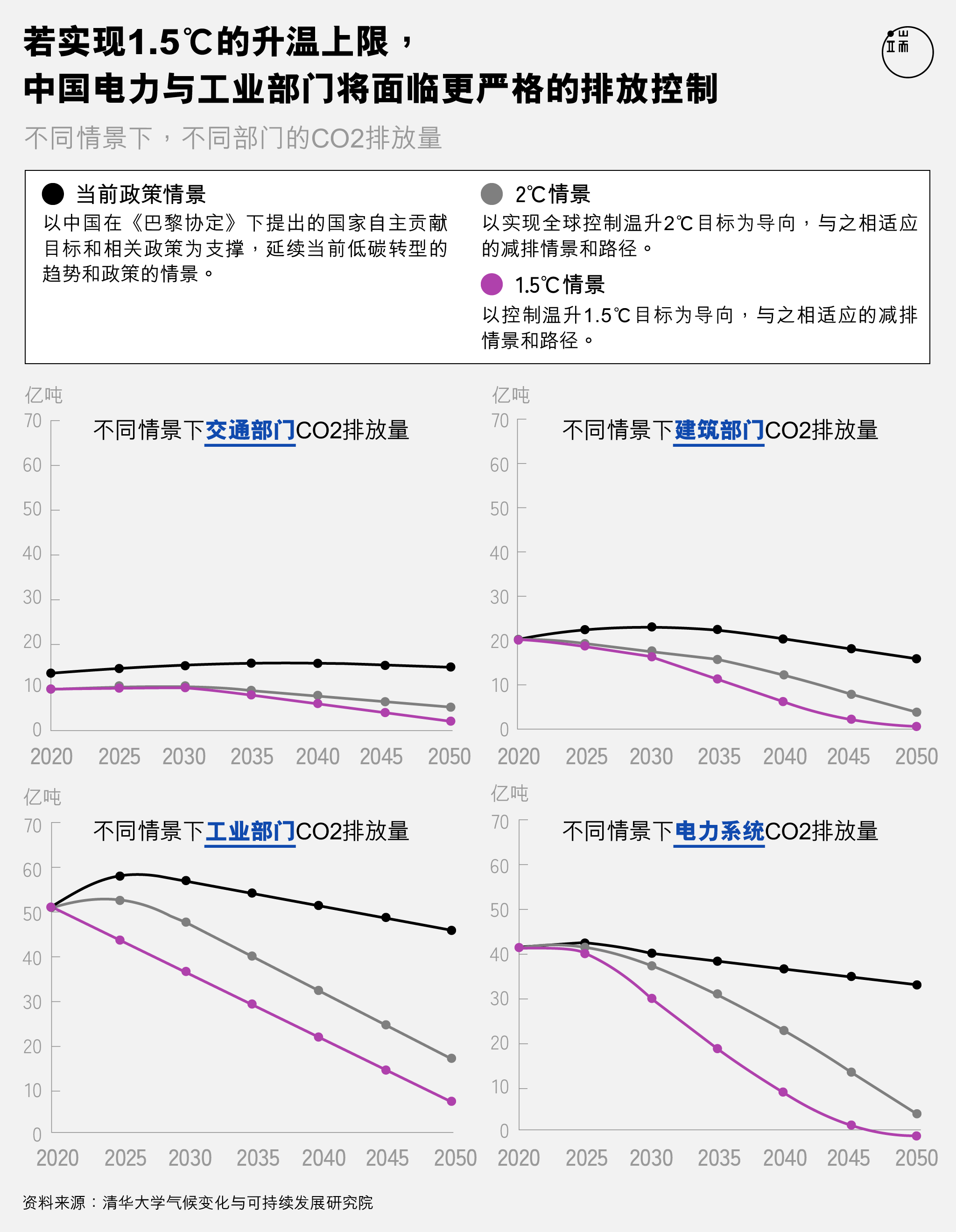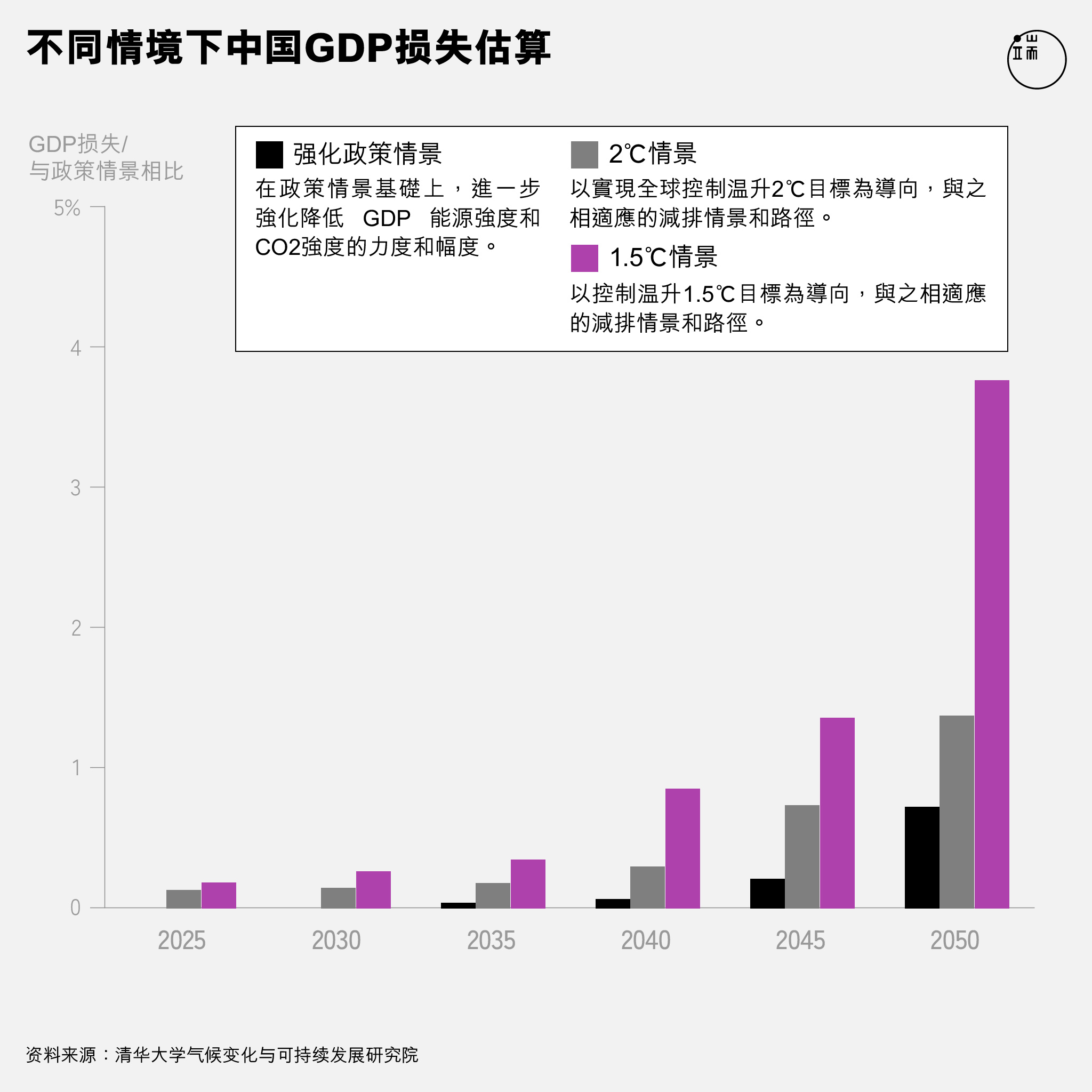 产业升级、动力转变,都意味著更多经济成本的投入。清华大学气候变化与可持续发展研究院的估算显示,若依照1.5°C的全球气温升温上限计算,2050年的GDP损失可能接近4%。不过与此同时,PM2.5浓度会下降,环境质量也会大幅度提高。