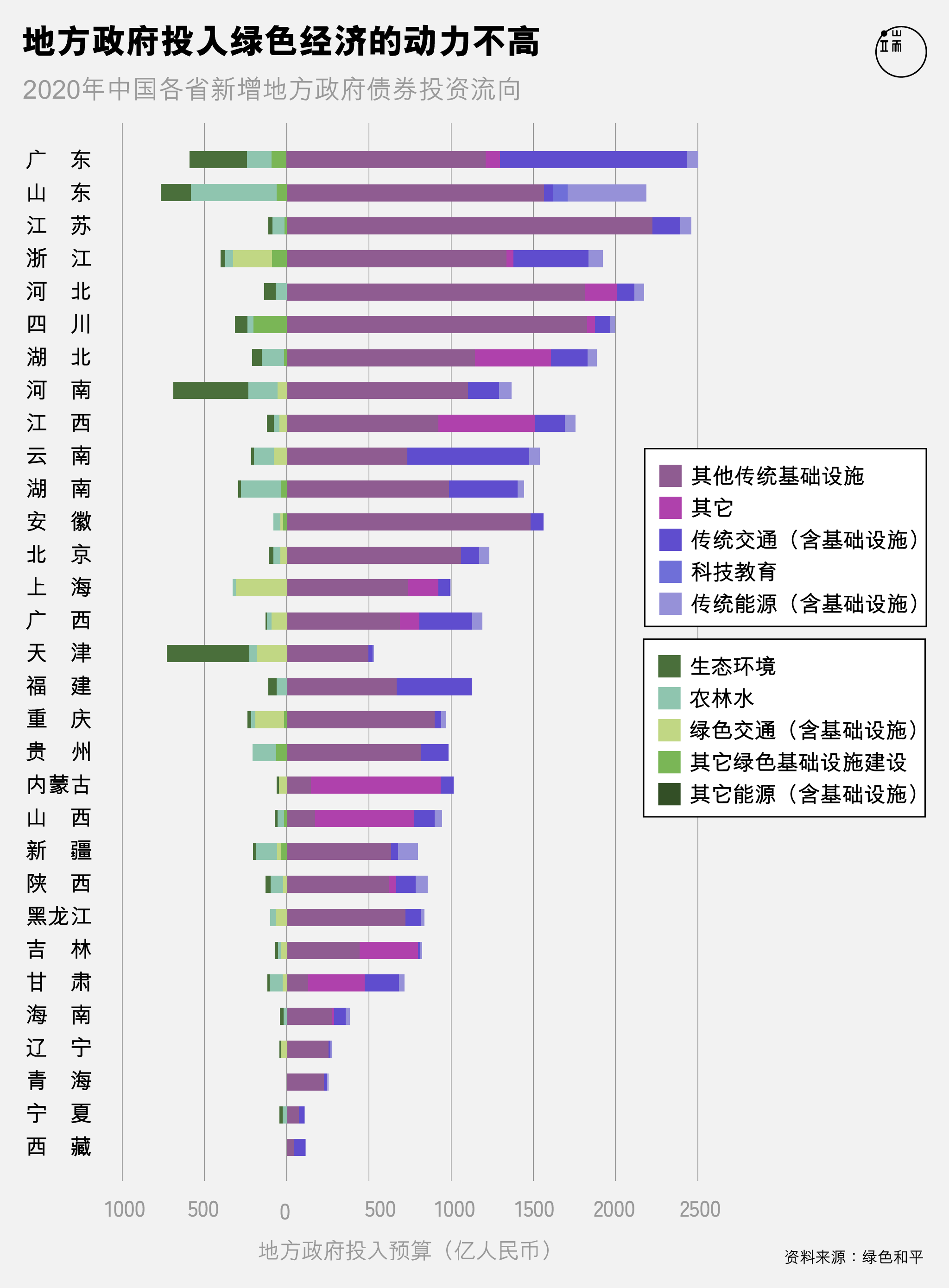 事实上,根据国际环保组织绿色和平的统计数据,2020年中国全国人大批准了6.35万亿的财政刺激计划,以应对Covid-19疫情带来的经济冲击,然而各地地方政府新增的地方债中,却很少投向绿色经济。不仅如此,2020年地方政府还放开了燃煤电厂的批准许可,使得大量额外的煤电装机落地。