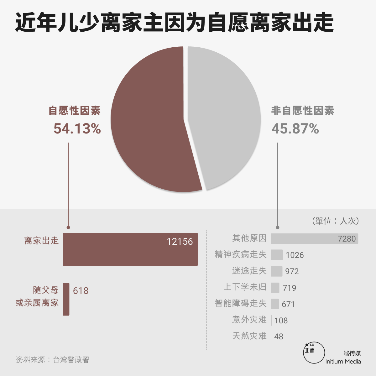 在1970、80年代,台湾社会频传的失踪儿少多为拐骗、掳人勒赎,让家长人心惶惶;目前,台湾每年失踪人口比例以儿少失踪为大宗,且以12至17岁的少年居多,主因半数为自愿离家出走。根据警政署统计,只有儿童以随亲属带离家里(被家人带走)居冠,其他年龄层都是自愿离家出走。而少年失踪的原因,又以七成的离家出走比例高出其他年龄层。