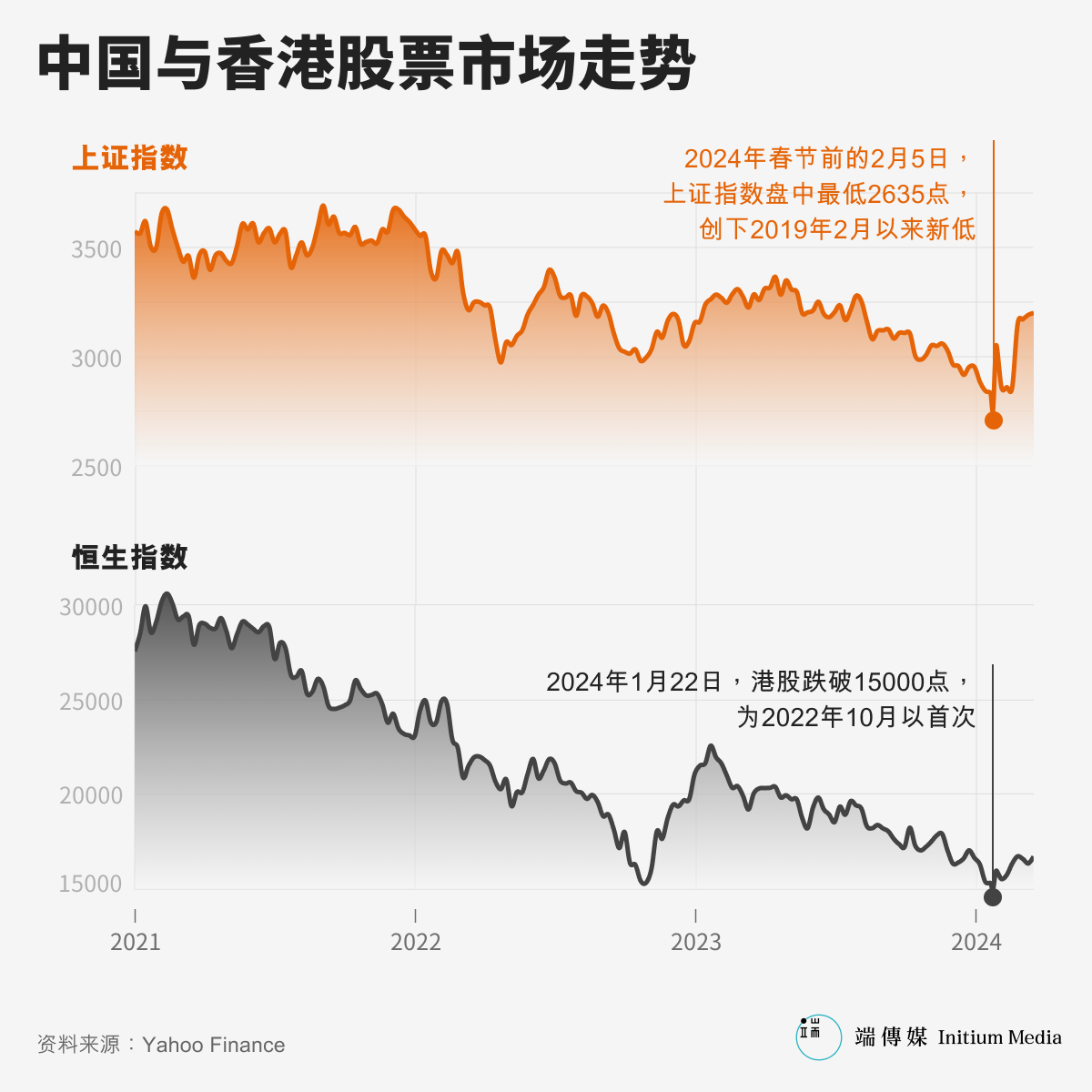 自2023年下半年开始,中国A股就进入了跌跌撞撞的滑坡模式,从3300点附近一路下滑,到去年10月,成为2020年7月以来首次跌破3000点的时刻。12月,股民口中的“3000点保卫战”逐步下调为2900点保卫战、2800保卫战、直至2700点。就在2024年春节前夕的2月5日,上证指数盘中最低2635点,创下2019年2月以来新低。香港恒生指数也在1月22日创下15个月来历史新低,跌破15000点大关,收于14961点。然而春节期间正值官方媒体吹鼓“乐观向上氛围”的高峰。《人民日报》2月2日发表例行贺岁稿《整个国家都洋溢着乐观向上的氛围》、自欺欺人地虚假宣传,引起了更多民间抵触情绪,该微博随后关闭留言。群情激愤的股民各类情绪无处宣泄。