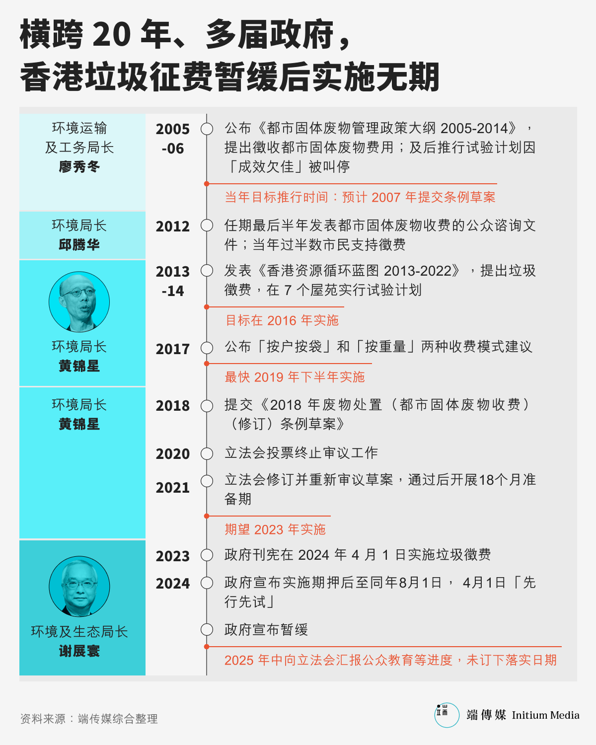 2005年董建华年代,时任环境运输及工务局局长廖秀冬在“都市固体废物管理政策大纲”中提出都市固体废物收费,指视乎公众咨询结果,预计在2007年向立法会提交条例草案。廖秀冬当时表示,香港正面对迫切的废物问题,如市民不改变消耗型的生活习惯,堆填区将于六至十年内饱和。