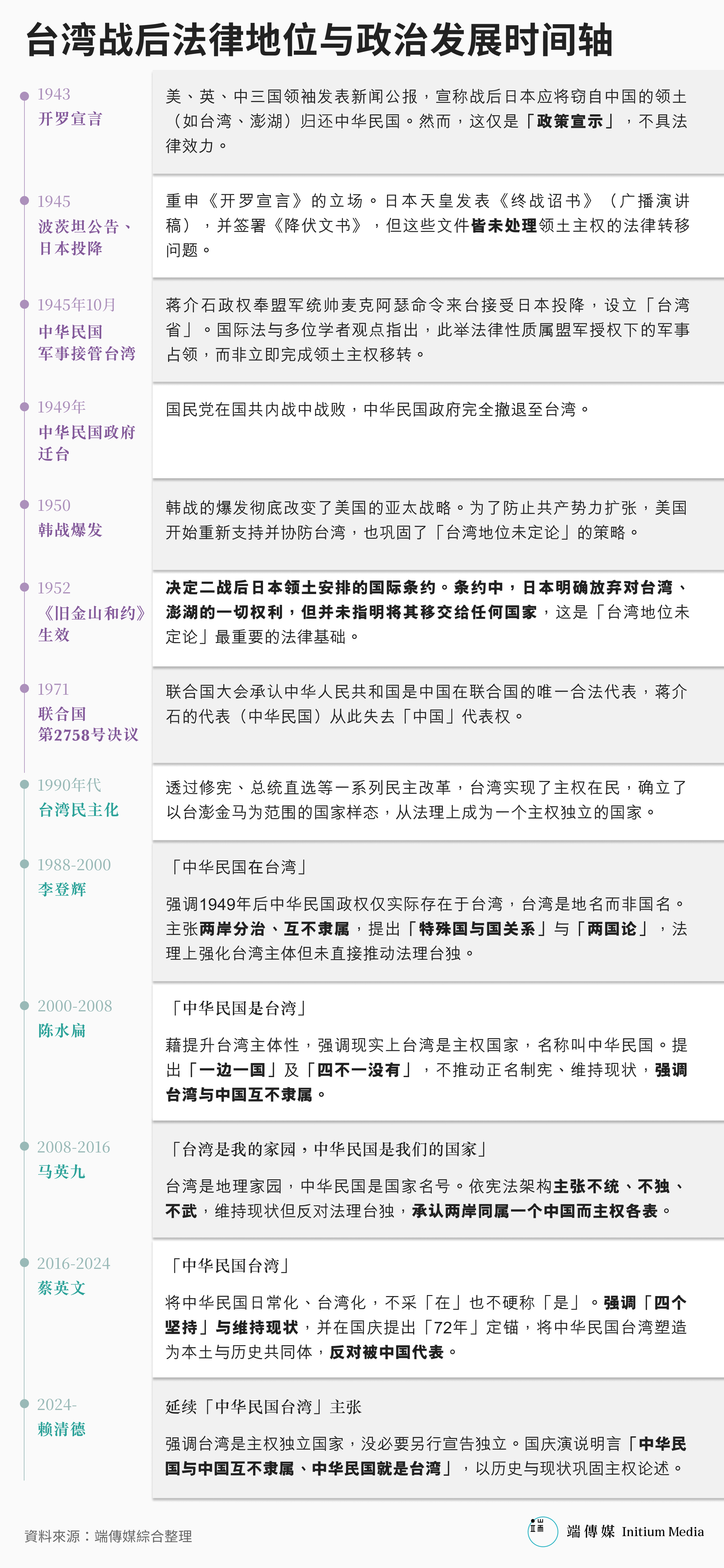 自第二次世界大战结束以来,台湾的法律地位一直不确定,各方持续对其主权提出异议。在韩战爆发(1950年)后,美国总统杜鲁门(Harry S. Truman)宣布“台湾海峡中立化”,并派遣第七舰队防卫台湾。当时,美国同时声明:“福尔摩沙(台湾)未来地位的决定,必须等待太平洋地区安全恢复、与日本签订和平条约,或由联合国审议”。