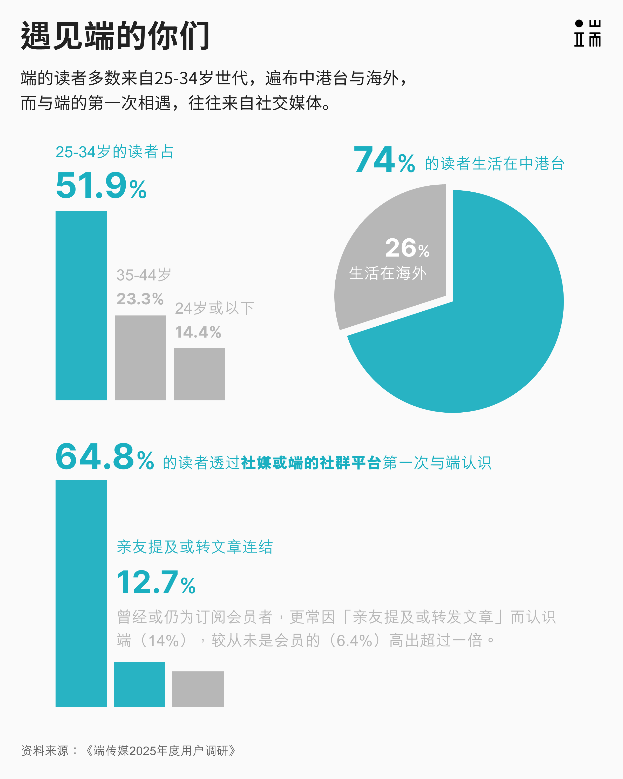 端传媒十岁了,今年,我们特别将2025年度用户调研的结果,整理成了这份报告。会这样做,源于多位读者提到的一种感受:作为端的会员,有时会有些孤独——不知道「还会谁和我一样在读端?他们来自哪里?在想些什么?」小端能理解这样的感受,而尝试回答这些问题,正是小端存在的价值。
