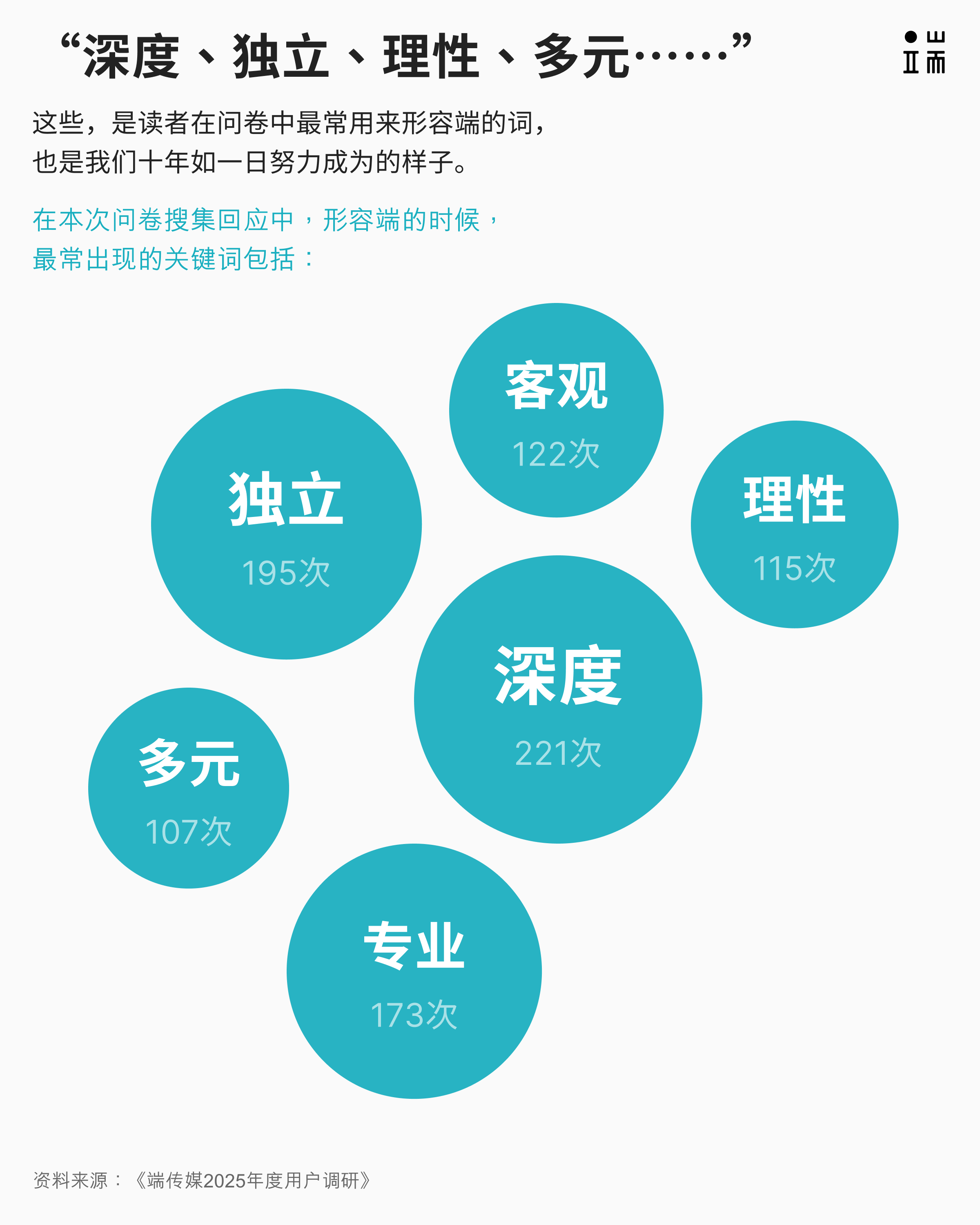 在本次问卷搜集回应中,形容端的时候,最常出现的关键词包括「深度」(221次)、「多元」(107次)、「专业」(90次)、「独立」(64次)、「客观」(56次)和「中立」(42次)。