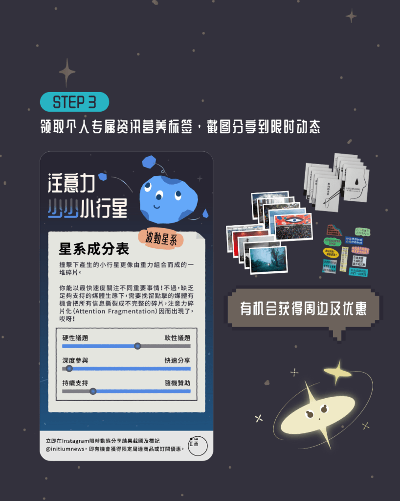 透过情景问答,你将会进入一个被资讯过载和演算法支配下,进入扁平时代的未来。当所有话题变得单一乏味,你跟朋友决意出发,重建久违的多元世界。我们偏好不同议题的形式、接触内容的方式以及支持媒体的模式,跟大家经常讨论的注意力碎片化、过滤气泡、末日刷屏以至回音室效应现象之间会否有意想不到的连结?性格测验尝试分析你的新闻接收模式,你更可以透过限时动态分享分析结果并跟身边人比较各自的媒体使用习惯,同时有机会获得限定周边商品或订阅优惠。