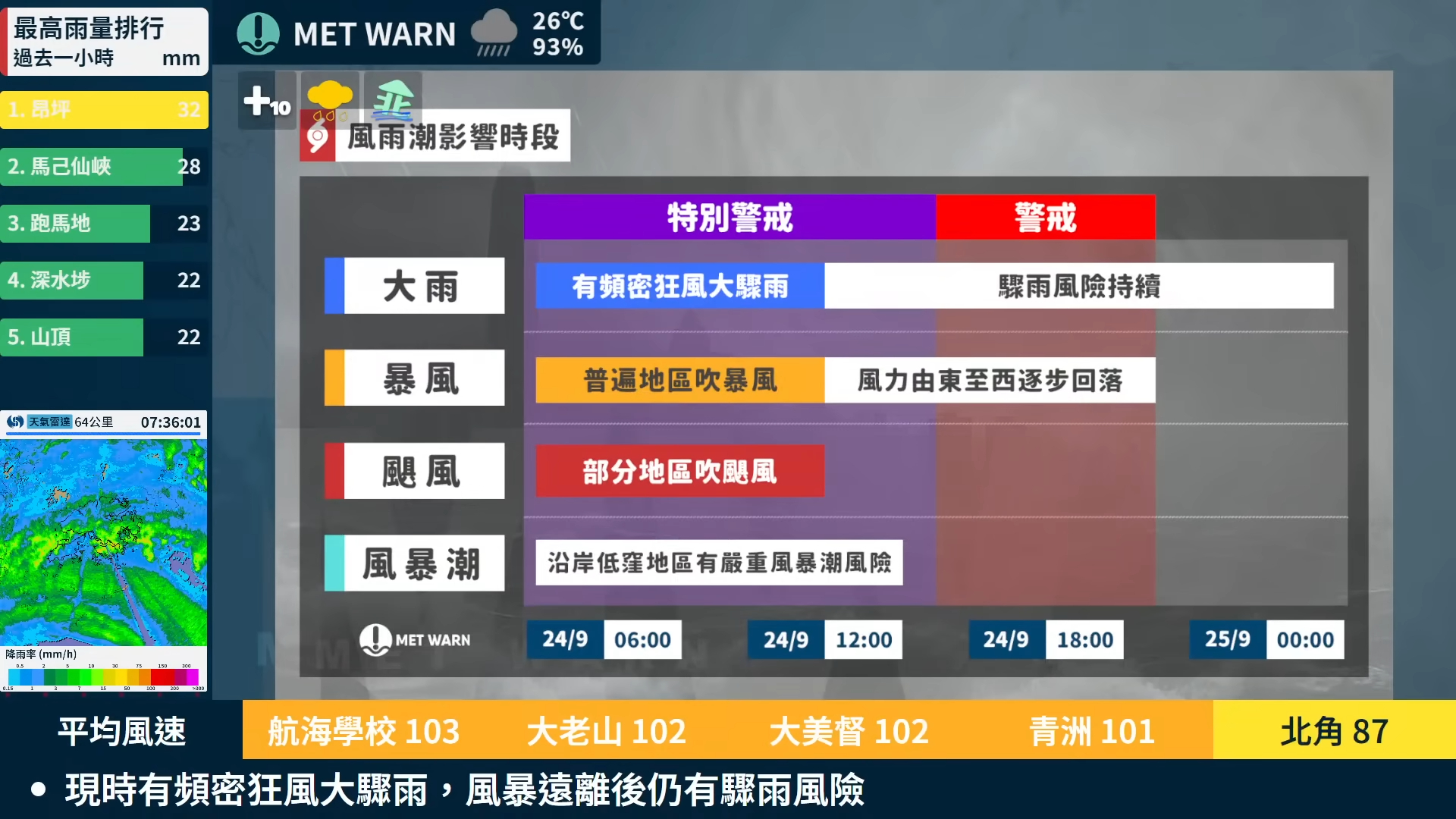 9月22日当晚,MET WARN 进行了一小时的风暴直播,观看次数达11万。节目铺排如电视台新闻报导:以片头和配乐导入、主播东岳字正腔圆念读资讯,配合风暴图、自制图表和字幕走马灯。镜头一转,切换到维港和九龙湾等的现场情况。