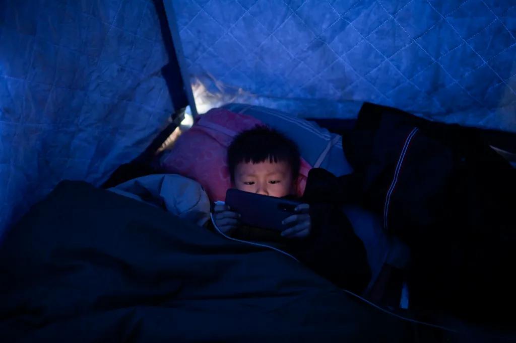 2023年12月20日,中国甘肃,在帐篷看手机的小孩。摄:Pedro Pardo/AFP via Getty Images