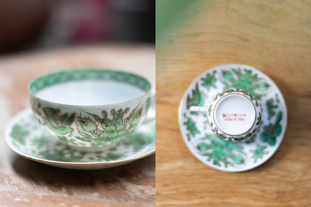 日本版《香港百货》的封面是一幅绿色捆金漆边花叶图案的瓷器杯碟组,香港粤东磁厂五、六十年代生产,杯底红色笔迹写著“日本烧制,香港上色”。这个杯碟组也是美由纪过去在摩罗上街找到的宝物。当年韩战爆发令中国产品被禁运,磁厂需改由日本进口瓷胎加以说明,才能出口。而日本进口的瓷胎刚好来自美由纪的故乡名古屋,历史翻了一个折,瓷器杯碟又成为一本日本人撰写的《香港百货》封面图片。