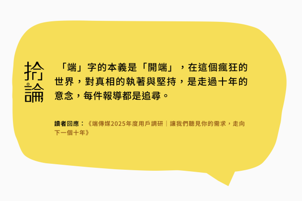 欢迎你继续在端传媒网站、应用程式和各社交媒体平台撰写评论或分享所想,有更多意见或回馈也可写信给我们(editor@theinitium.com)。我们期待聆听你的想法。