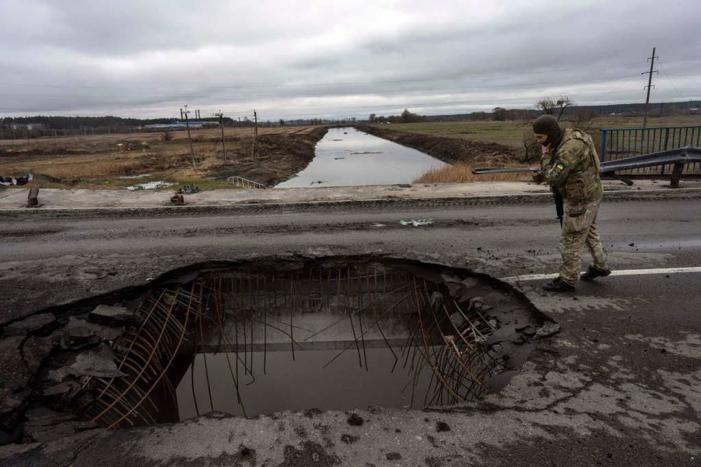 2022年4月2日,乌克兰布查一座受损的桥梁。摄:Rodrigo Abd/AP/达志影像