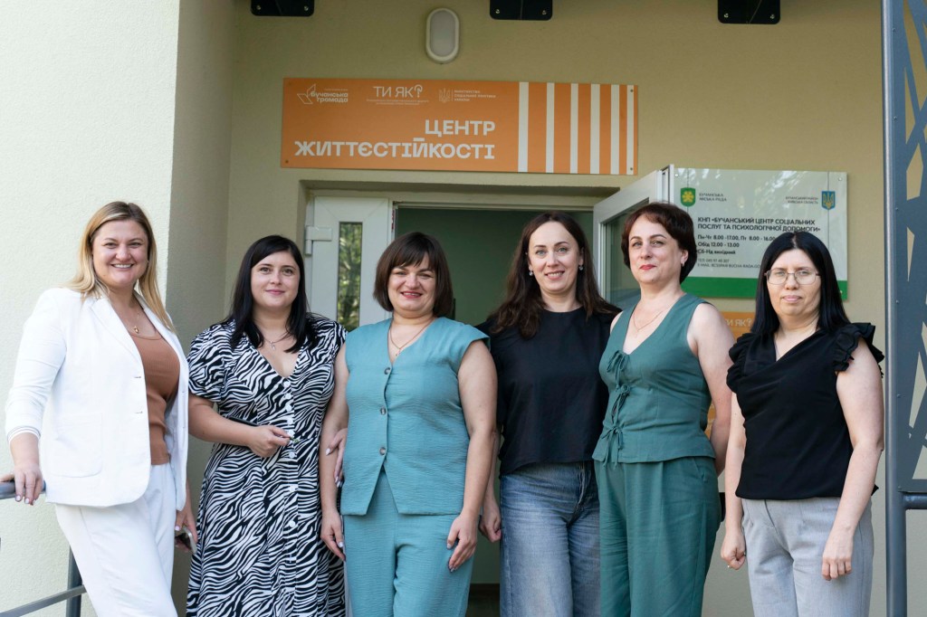 “布查韧性中心(The Bucha Resilience Center)”的主任(右一)与咨商师们站在中心外合影。摄影:陈映妤