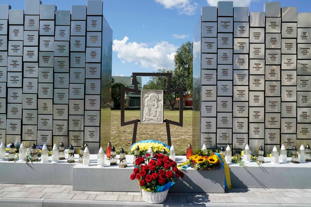 布查大屠杀纪念碑,有名字的碑文为已确认死者身分,空白处则留给仍在确认身分中的数十位死者。摄影:陈映妤