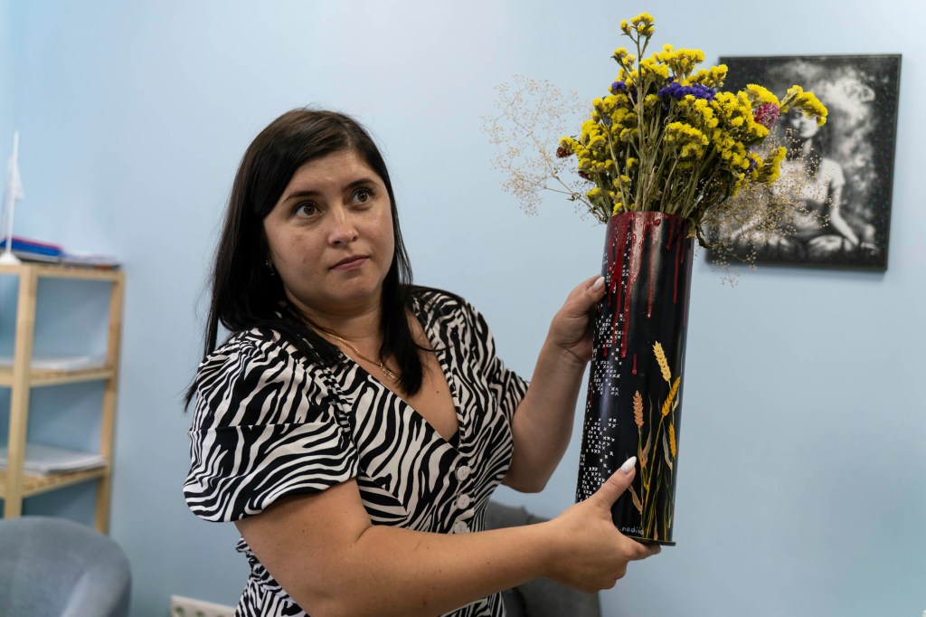 布查韧性中心的咨商师米哈伊利夫娜介绍其中一堂疗愈课程,是将俄军留下的砲弹残骸,切割彩绘后变成花器。摄影:陈映妤