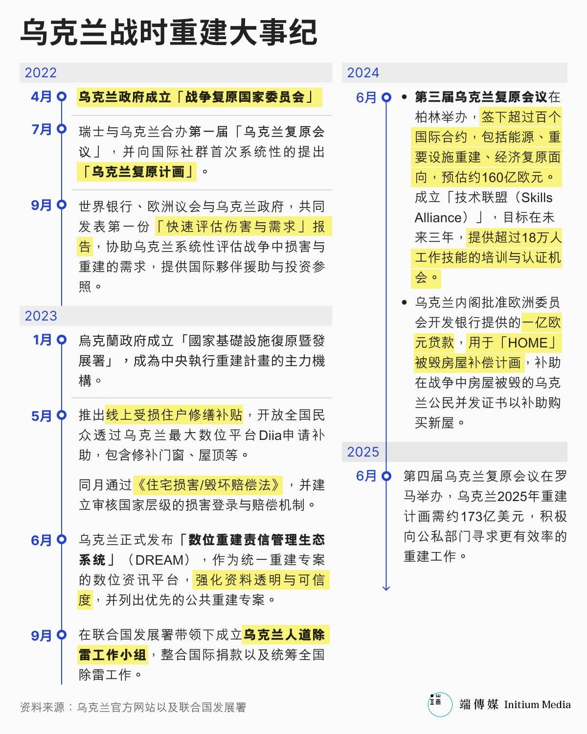 乌克兰在2022年,建立“战后复原国家委员会”,作为全国复原蓝图与工作小组的统筹平台,并每年在欧洲举办“乌克兰复原会议”,积极整合国际资源,对接乌克兰被战争影响的社区。
