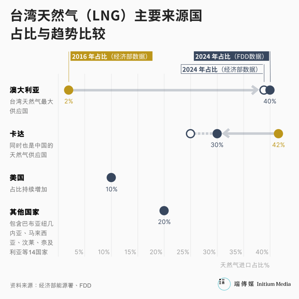 台湾现阶段主要电力来自火力发电,2024年的数据显示,燃气发电占比约42%,燃煤则为39%。为满足庞大的发电需求,台湾去年进口了2113万公吨的煤炭。这使得台湾的“进口能源依存度”(指能源总供给中依赖进口的比例)长年超过95%,若单看石油及天然气,依存度更是惊人的99%。