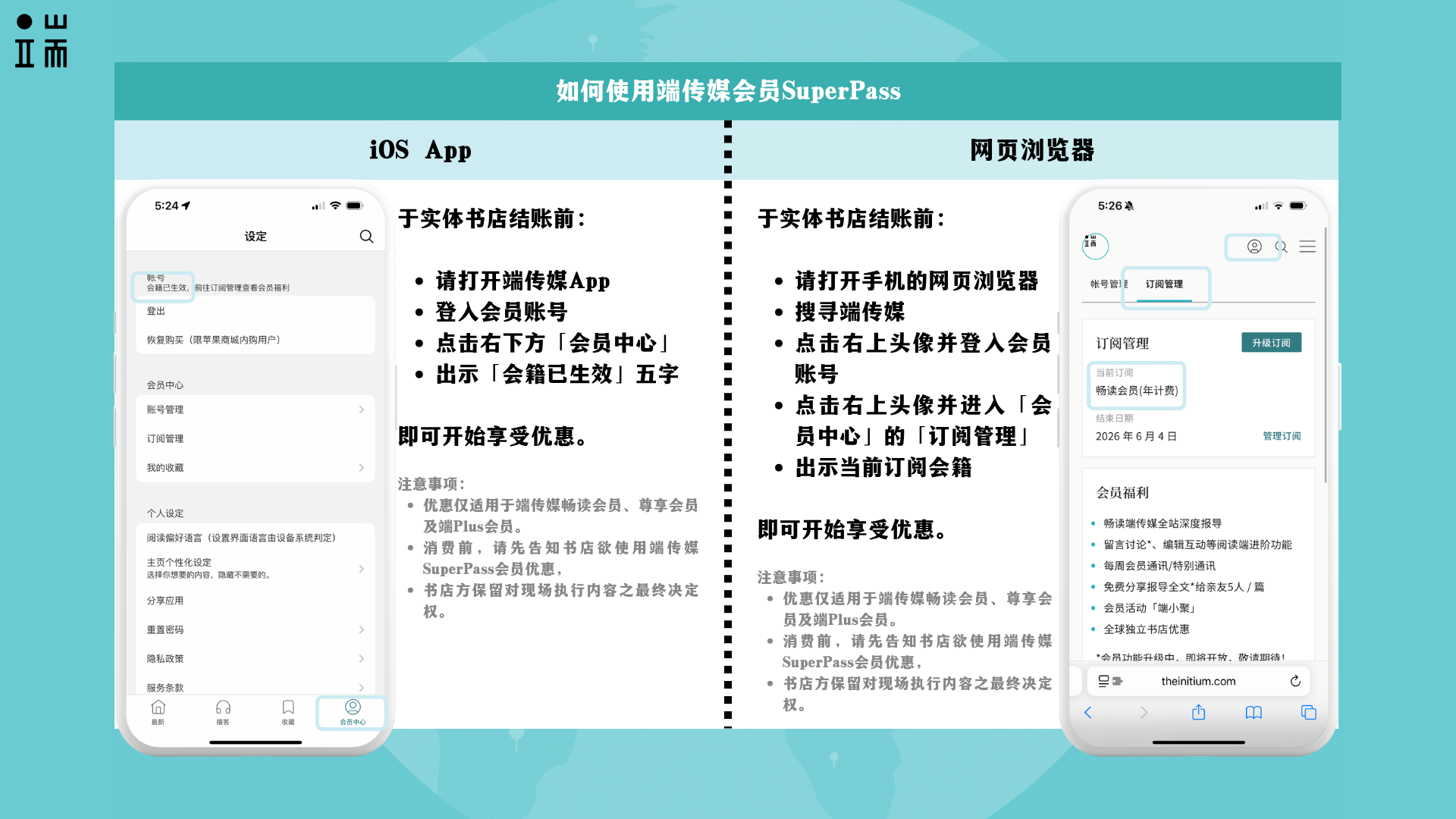线下优惠:于书店结帐时,使用端传媒手机应用程式(App)或是网页浏览器登入会员帐号,按步骤向店员出示会员身份,即可享有相关优惠。