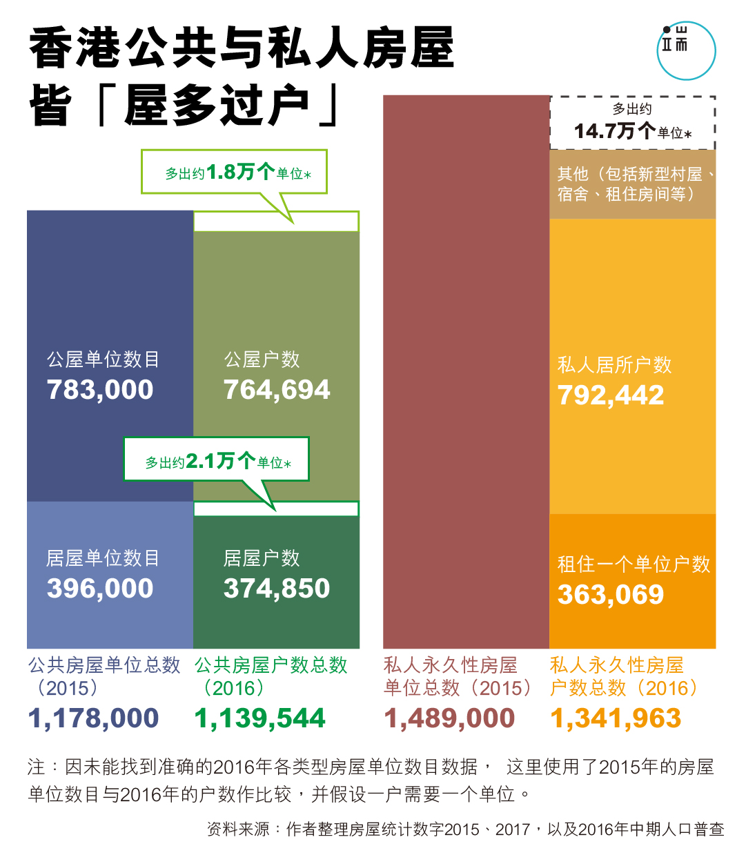 因为未能找到准确的2016年全港单位数目数据, 这里使用了2015年的单位数目与2016年的总户数作比较。根据图一,香港2016年的总户数大约是250万户,也就是说,2015年全港房屋单位总数(约267万)比2016年的全港总户数要多出约17万间。如果每户以2.7人(2016年公屋每户平均人数)计算,17万个房屋单位就可以住大概46万人。这两年建设的房子更多,理论上可以容纳更多人。